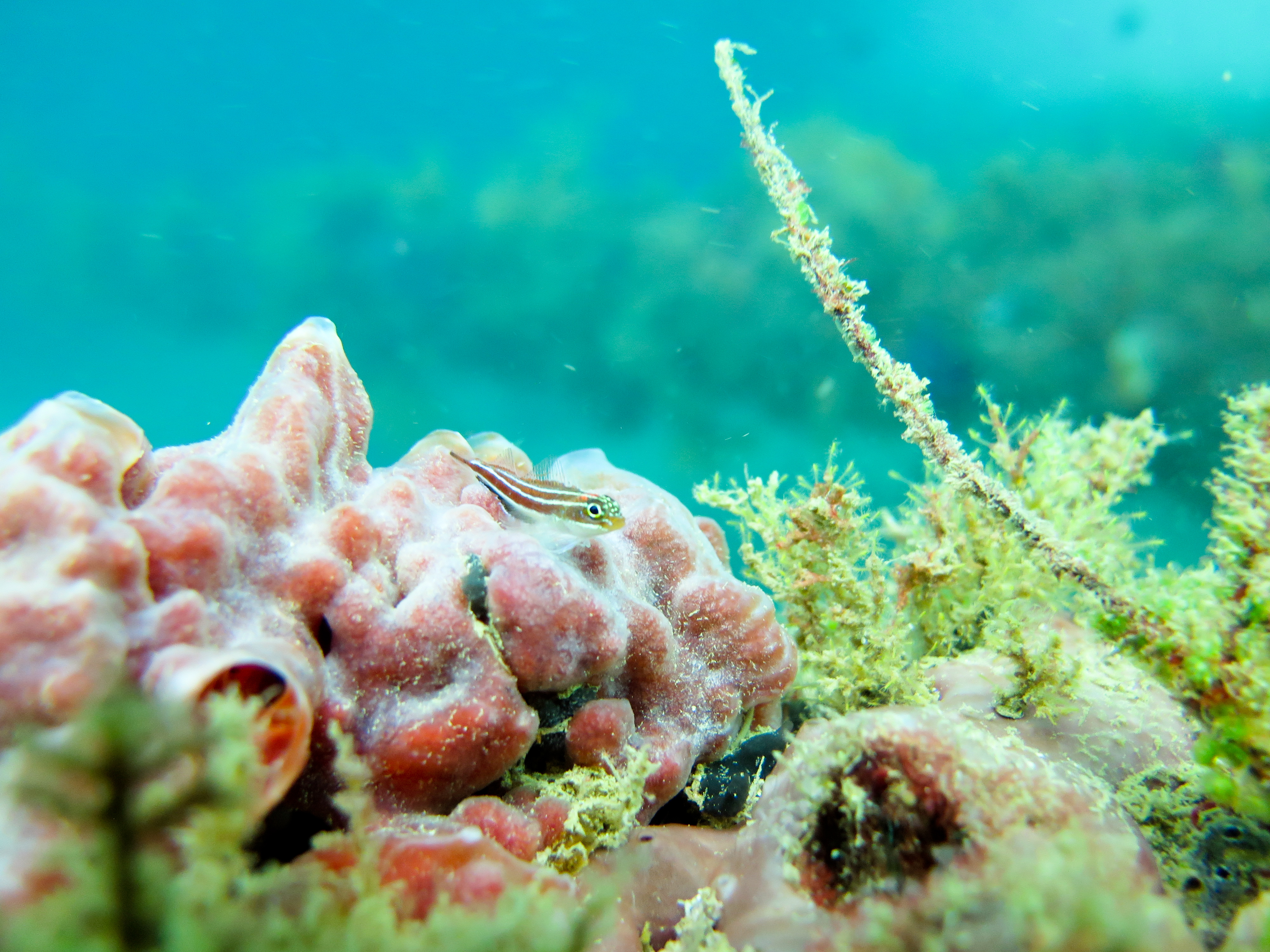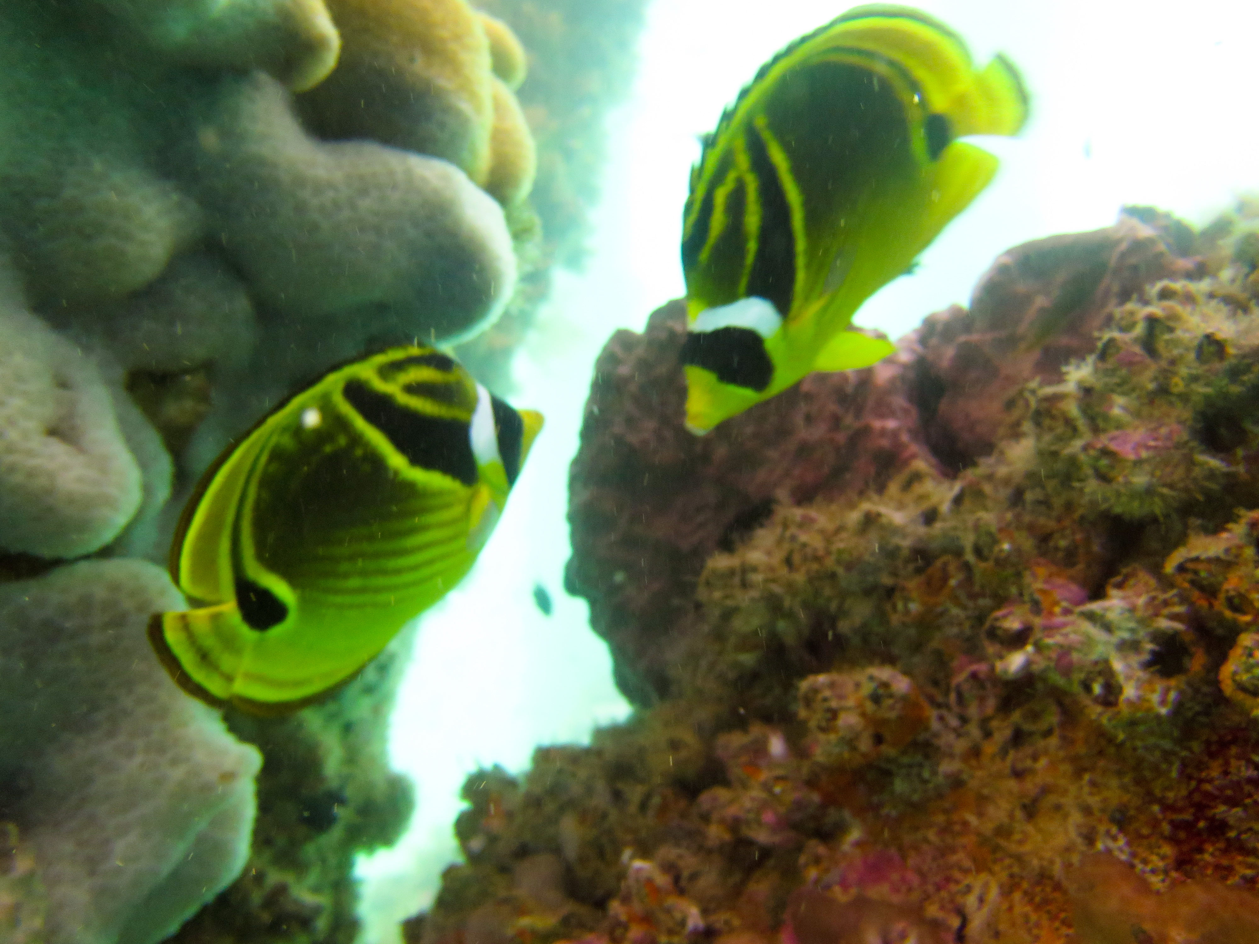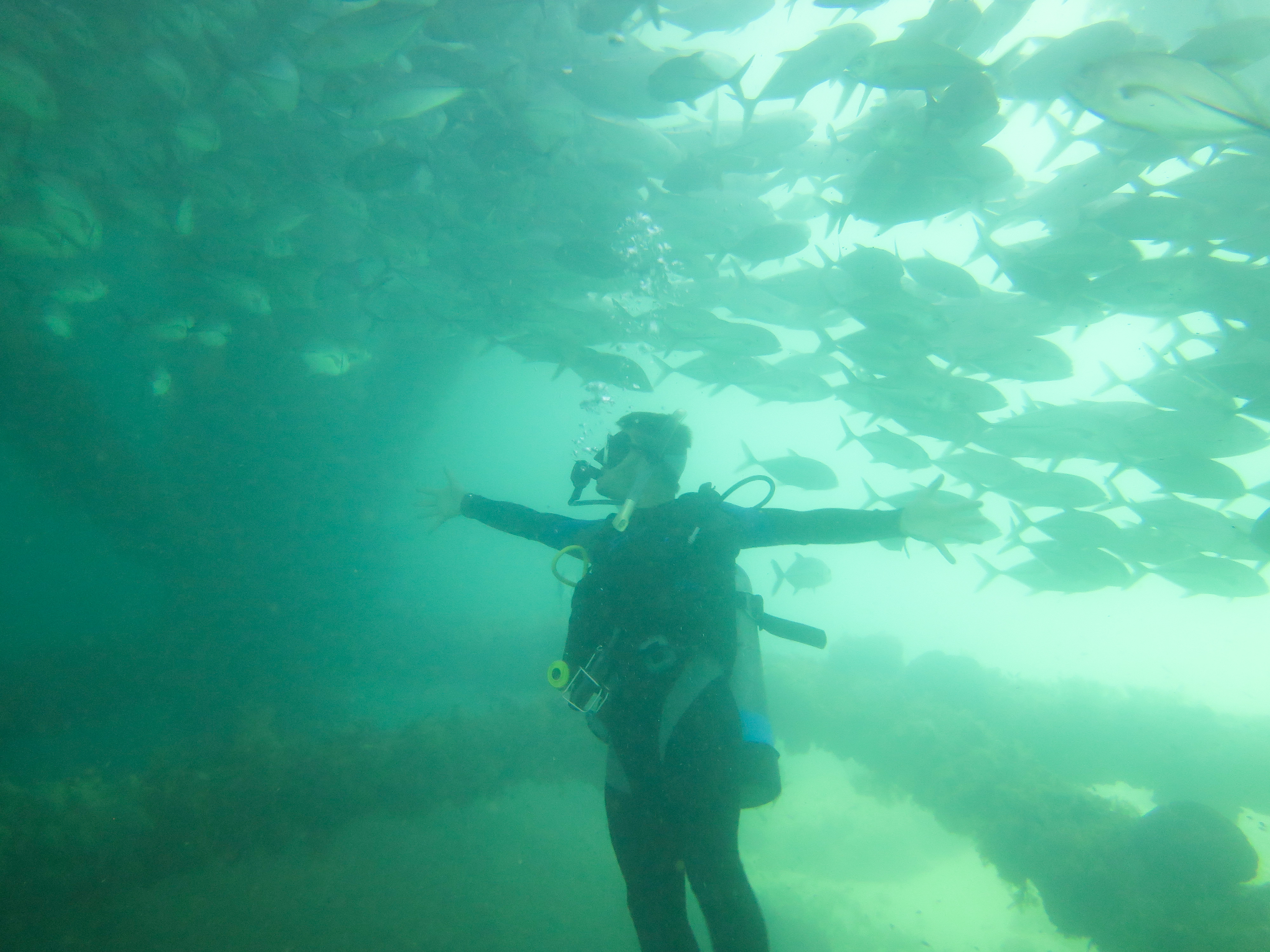 La visibilité était faible, moitié parce qu’il y a pas mal de particules dans l’eau, moitié parce que la population juvénile obstrue le décors. Décors absolument mis en valeur par des jeux de lumière qu’offre les journées très ensoleillé de cette région d’Australie…