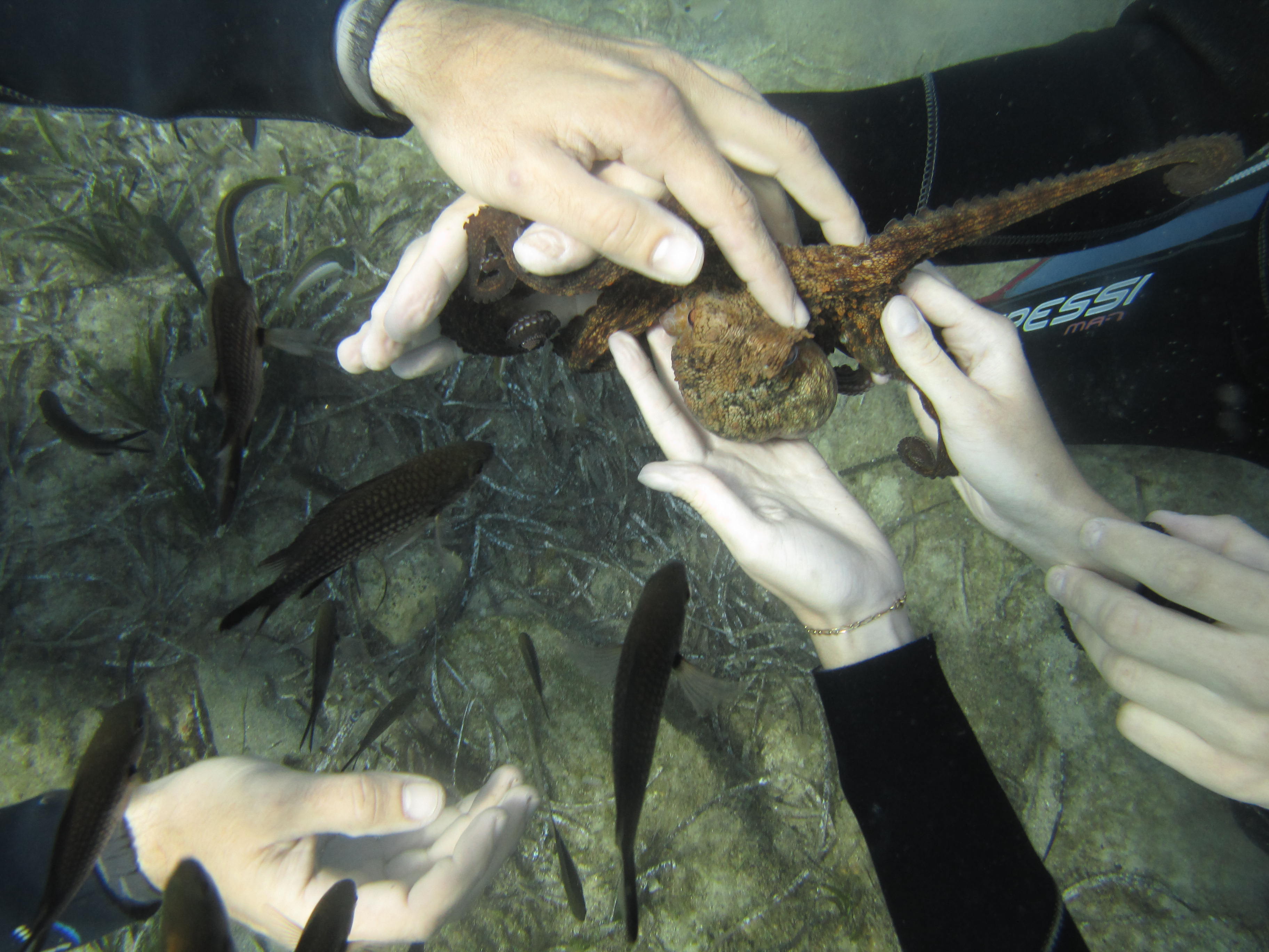 Je trouve l’exercice bien plus facile qu’il n’en a l’air car une fois débarrassé des deux problèmes que sont la flottabilité et l’équilibre de la bouteille, la plongée découverte devient une partie de plaisir ! Notre groupe par à la rencontre de la faune et de la flore. Au menu : poulpe, concombre de mer, crabes et bancs de poissons.